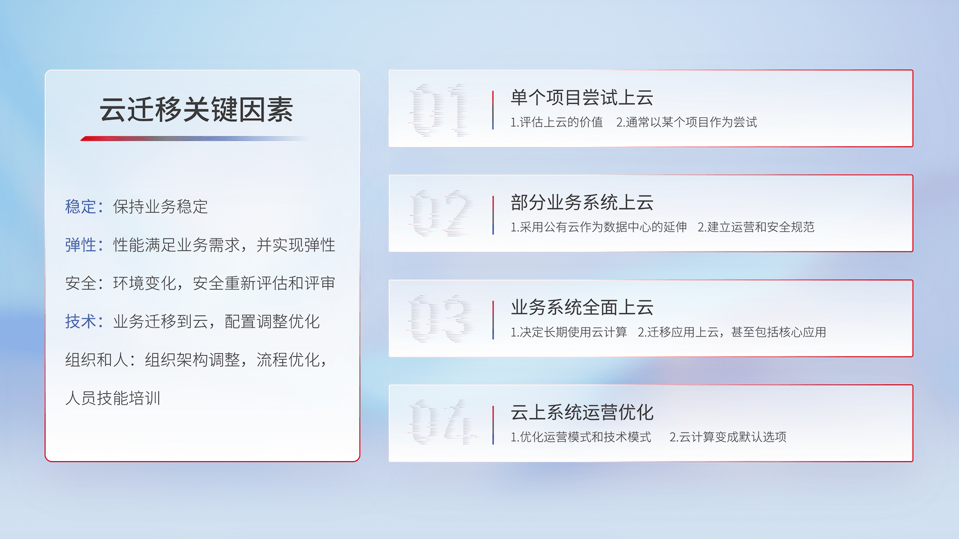 结合实际业务,,,,从规划设计、、云平台选型、、、云原生改造、、、、数据迁移、、集成交付,,,迁移全过程为客户识别最佳上云路径,,做好风险识别管理,,,,设计网络架构、、、身份权限、、安全审计合规、、、操作审计、、日志审计、、监控告警策略、、、多站点容灾设计等,,,,对云上基础设施进行整体规划,,,提升IT治理水平,,以满足弹性、、高可用、、、高性能的需求。。。