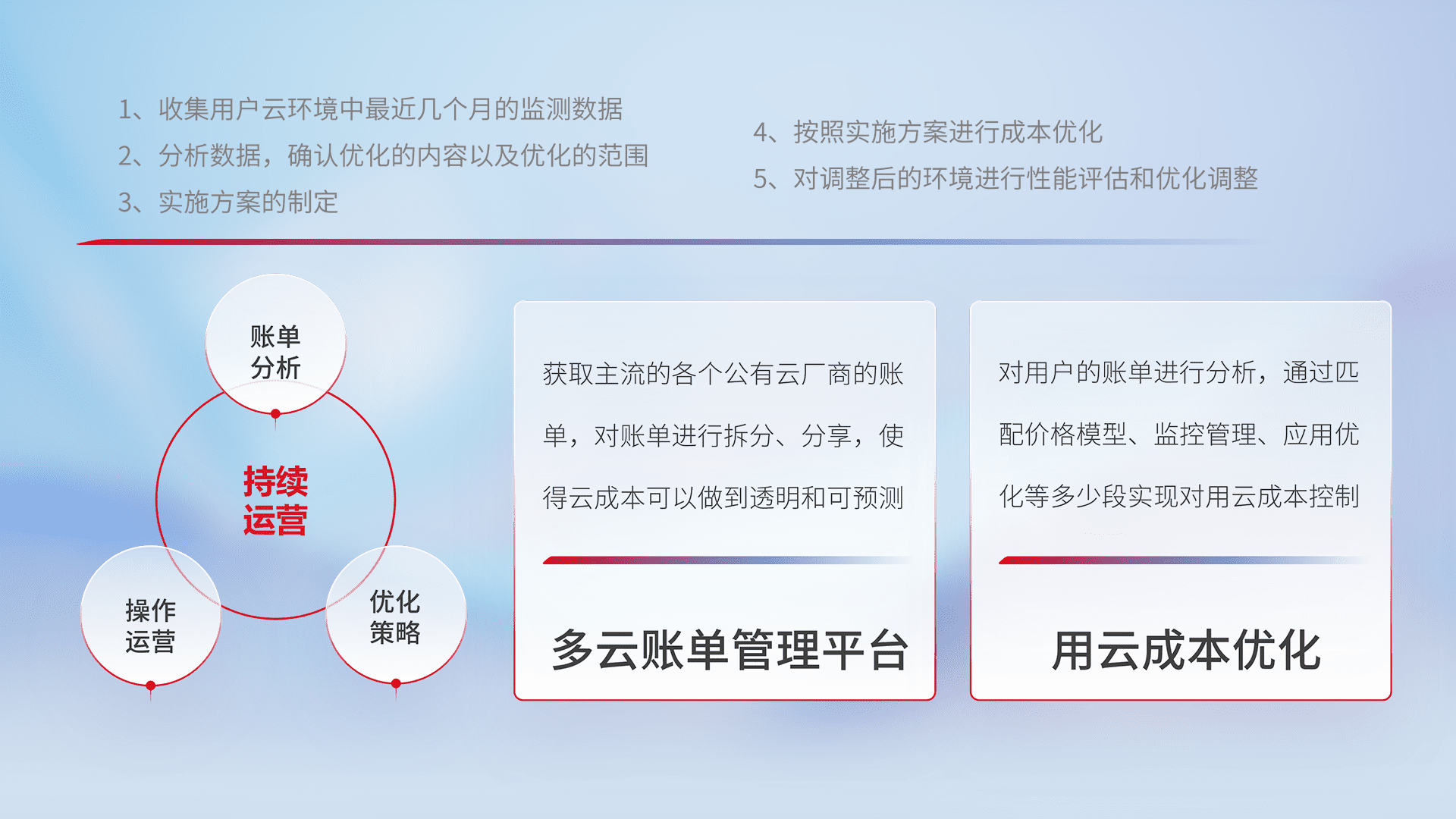 通过多云纳管,,,,以统一的资源数据模型把客户的云资源进行抽象和封装,,,,进而实现对多云资源的统一操作,,,,保障云资源管理的可靠性、、稳定性与可用性。。。量身定制化运维内容,,,,配置、、、、开发运维、、、补丁管理、、、、备份、、、监控、、、、认证和访问管理、、、、审计和日常巡检等,,,保障在用云过程中的可靠度,,,,稳定度以及高可用率。。。